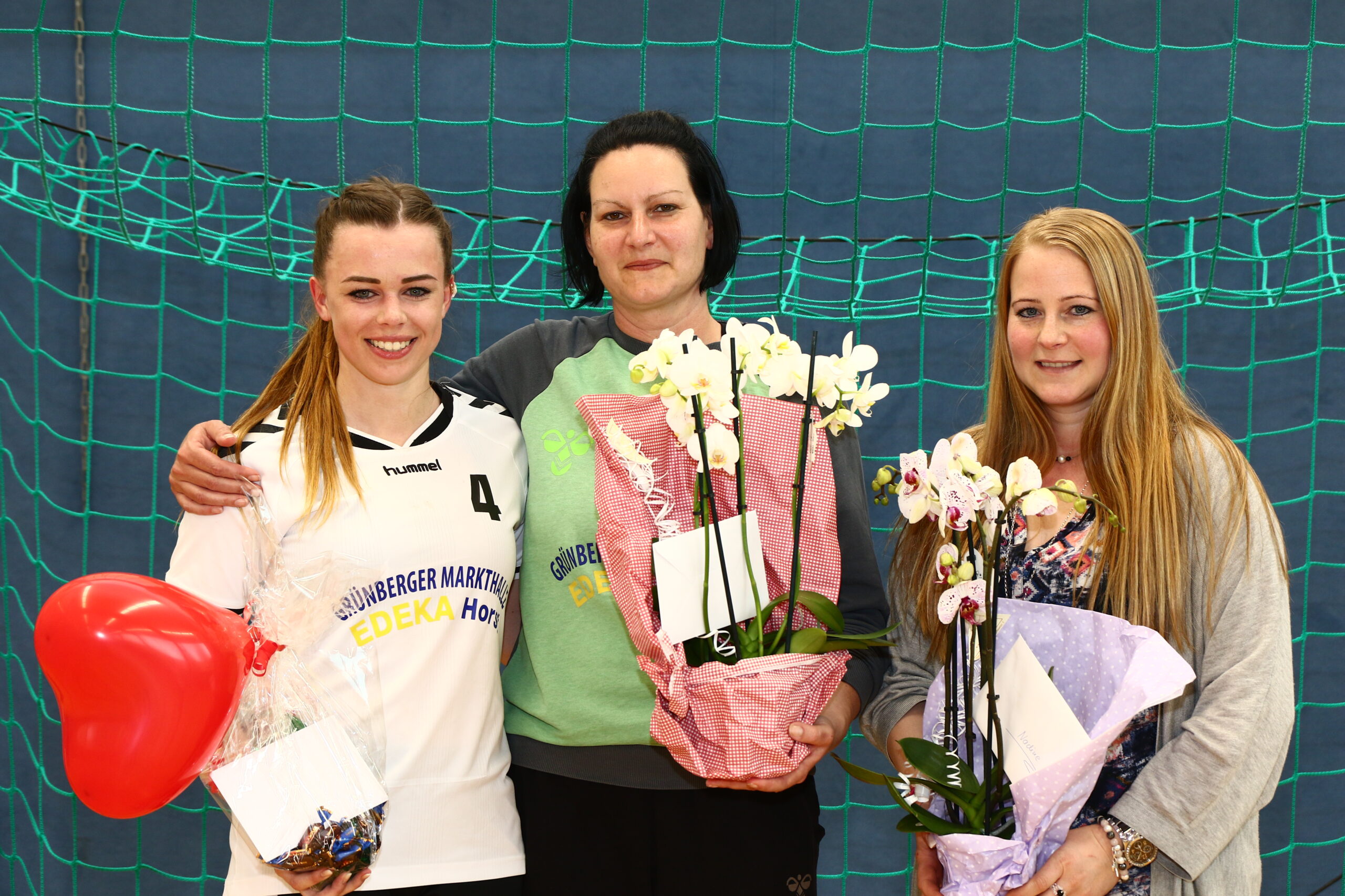 Zum Saisonende 17/18 hat sich die HSG bei Victoria Viebahn, Inga Christ und Nadine Böck bedankt. Victoria wird in der kommenden Saison leider nicht mehr bei der HSG Grünberg Mücke auf Torejagt gehen. Inga Christ beendet ihre aktive Laufbahn.
